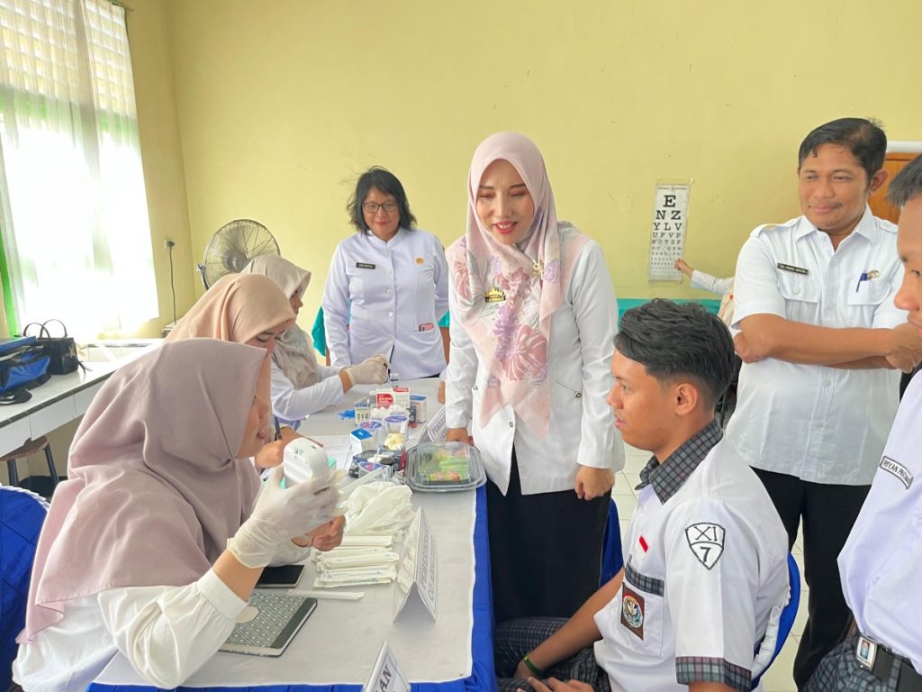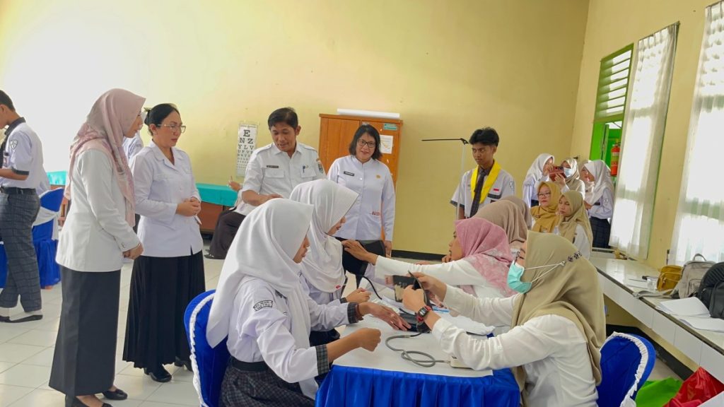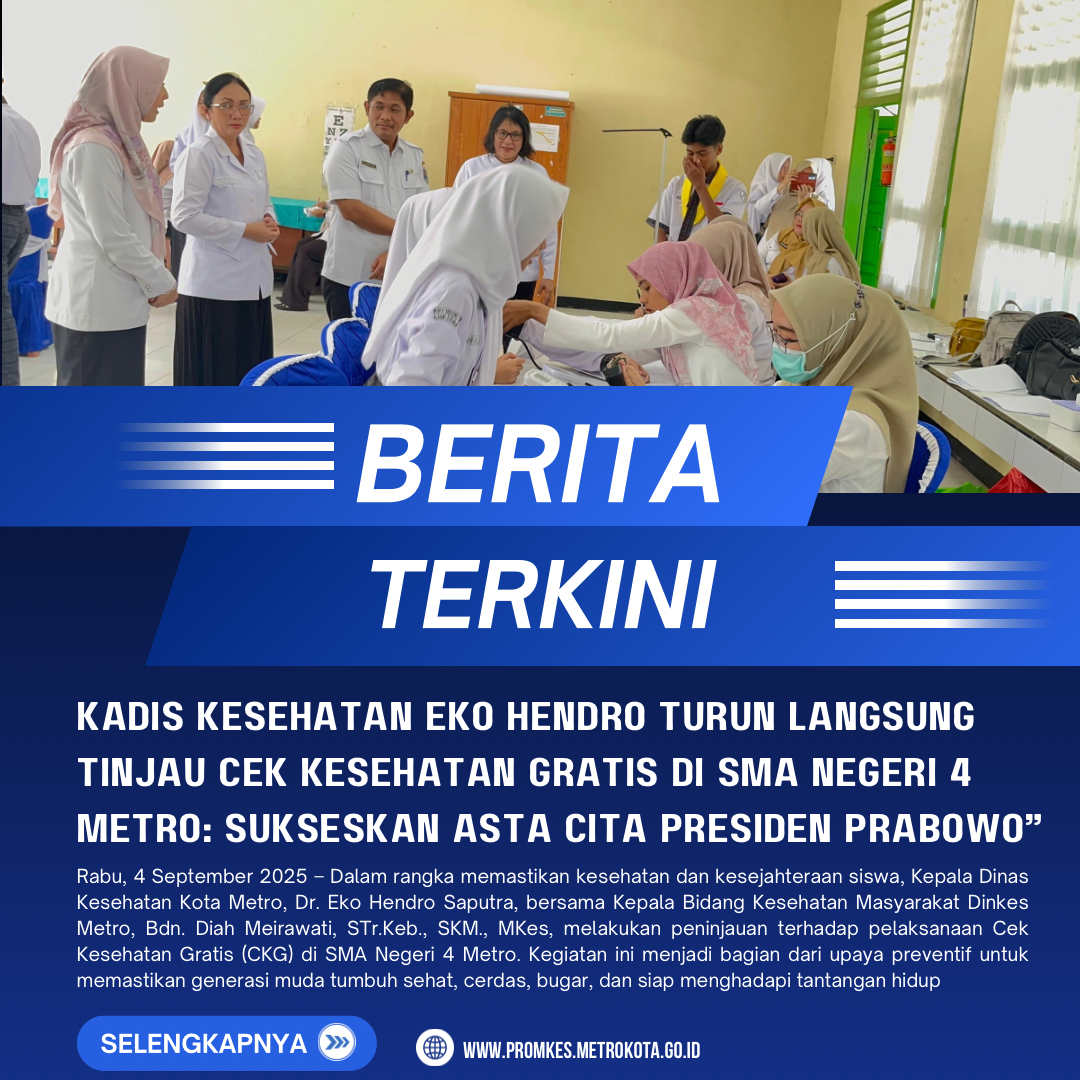 Rabu, 4 September 2025 – Dalam rangka memastikan kesehatan dan kesejahteraan siswa, Kepala Dinas Kesehatan Kota Metro, Dr. Eko Hendro Saputra, bersama Kepala Bidang Kesehatan Masyarakat Dinkes Metro, Bdn. Diah Meirawati, STr.Keb., SKM., MKes, melakukan peninjauan terhadap pelaksanaan Cek Kesehatan Gratis (CKG) di SMA Negeri 4 Metro. Kegiatan ini menjadi bagian dari upaya preventif untuk memastikan generasi muda tumbuh sehat, cerdas, bugar, dan siap menghadapi tantangan hidup, ikut serta juga dalam kegiatan ini Plt Kepala Puskesmas Tejoagung Opsi Okta Handayani, S.ST., M.Kes.