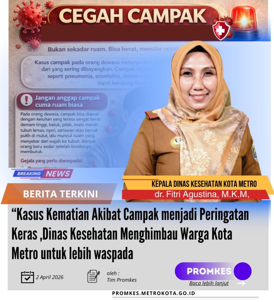 Metro, Kamis, 2 April 2026 — Kasus kematian akibat campak yang disertai komplikasi pneumonia menjadi alarm keras bagi masyarakat untuk tidak lagi menganggap campak sebagai penyakit ringan. Dinas Kesehatan Kota Metro pun mengimbau warga agar lebih waspada, mengenali gejala sejak awal, dan segera memeriksakan diri sebelum kondisi berkembang menjadi lebih berat.