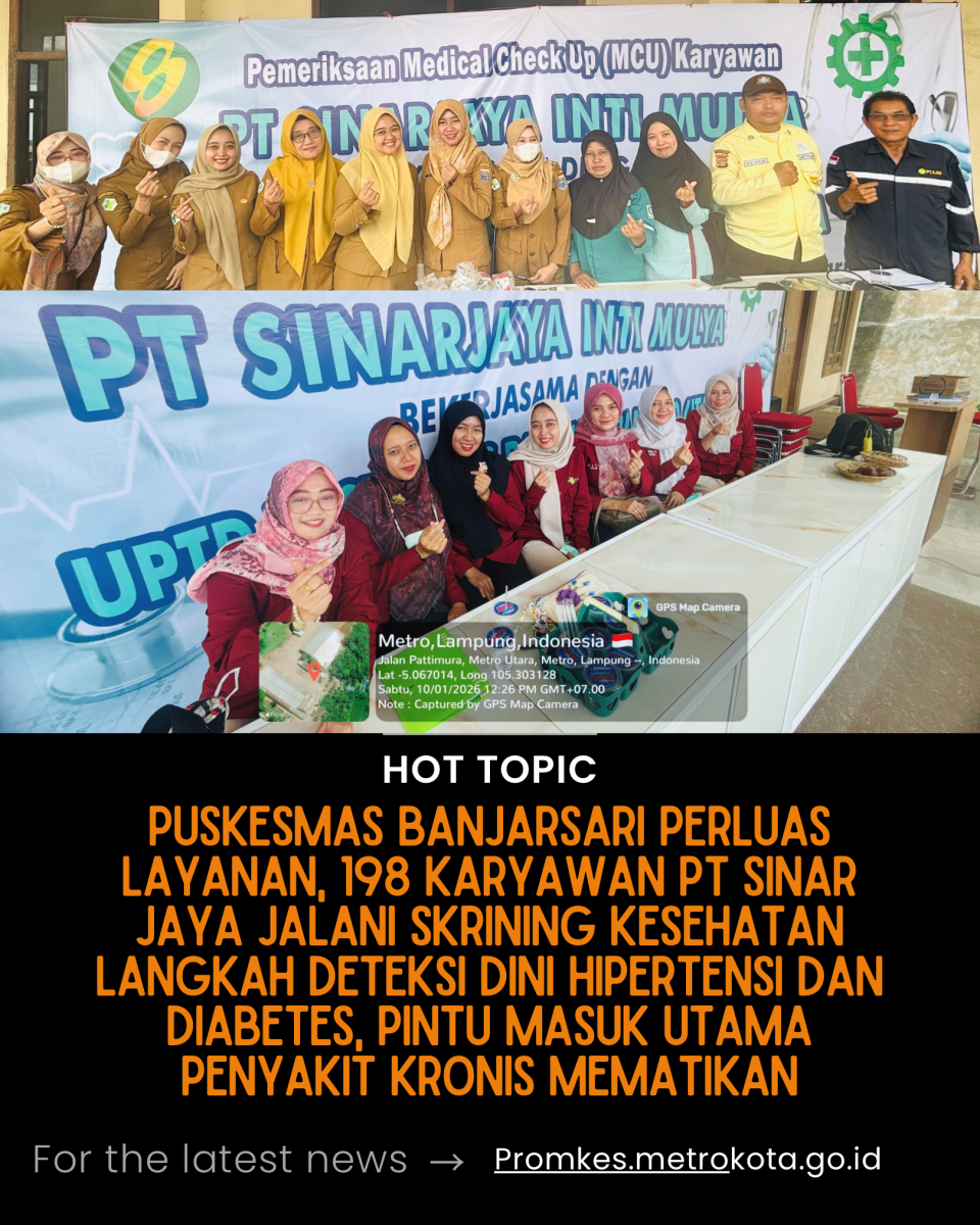 METRO. Puskesmas Banjarsari, Kota Metro, tidak menunggu warga datang saat sudah sakit. Tim layanan primer ini justru masuk ke lingkungan kerja untuk memotong keterlambatan deteksi penyakit tidak menular yang selama ini menjadi penyumbang beban layanan kesehatan. Selama dua hari pelaksanaan, Sabtu 10 Januari 2026 dan dilanjutkan Senin 12 Januari 2026, sebanyak 198 karyawan PT Sinar Jaya Inti Mulya di Kecamatan Metro Utara mengikuti skrining kesehatan yang difasilitasi Puskesmas Banjarsari.